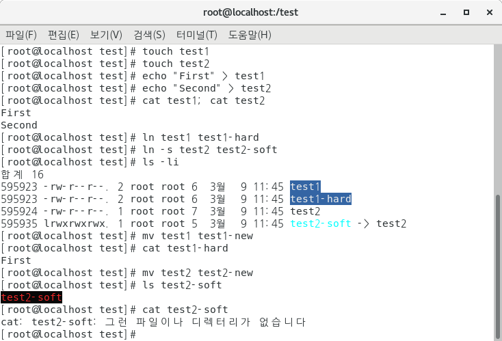 test2-soft는 test2에 대한 파일의 내용을 찾을 수 없습니다. test2가 삭제되면 test2-soft는 존재하지 않는 파일에 대한 링크일 뿐입니다.
