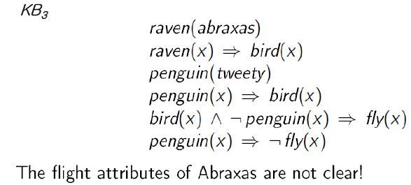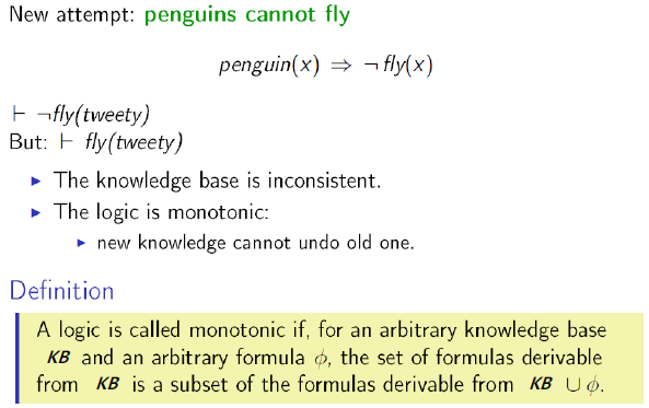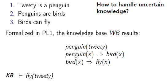 논리의 약점 중의 하나는 불확실한 지식을 표현하기 어렵다는 점이다. 왜냐하면 Logic 은 monotonic 하기 때문이다. 즉 Logic 에서 formula 가 참이면 새로운 지식이 들어와도 여전히 그 formula 는 참이기 때문이다. 인공지능 분야에 불확실한 지식의 예로 Flying Penguin 이라는 문제가 있다.