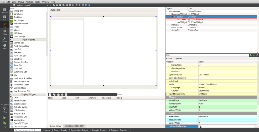 3. QSplitter가 적용되면 좌측 상단에 기존에 존재하던 treeWidget과 textBrowser의 상위 객체로 QSplitter가 생긴 것을 볼 수 있습니다.