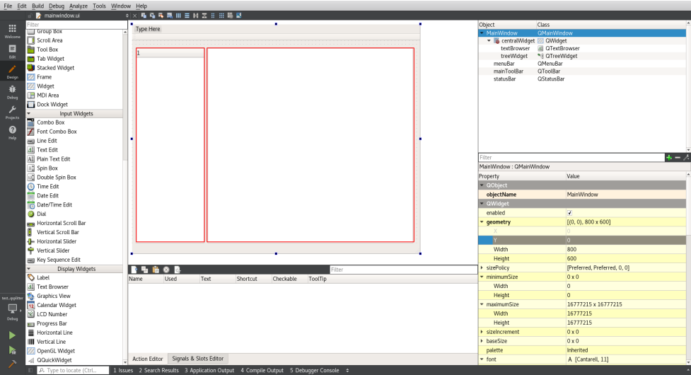 1. Qt Designer에서 QSplitter 기능을 사용할 treeWidget 및 textBrowser 등을 선택 후 드래그하여 만들어 줍니다.