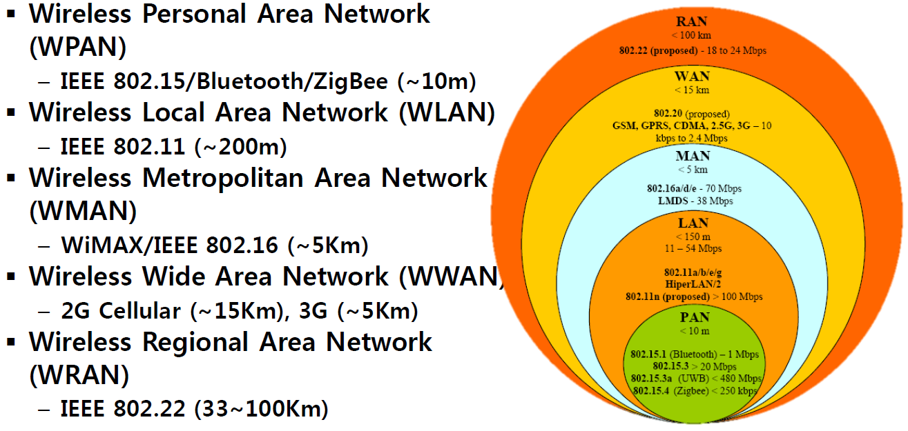 : 다양한 무선 네트워크가 지원하는 통신의 범위입니다.