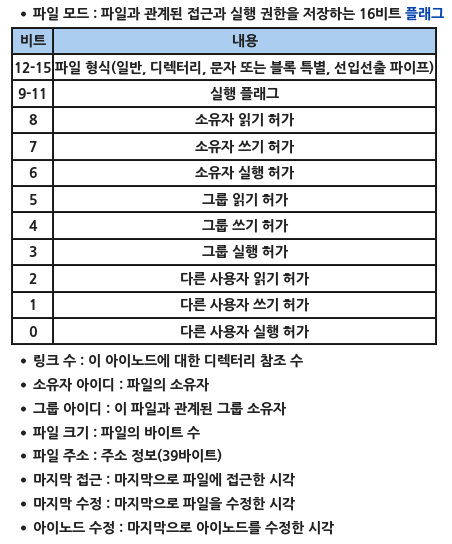 파일들은 각자 1개의 아이노드를 가지고 있으며, 아이노드는 소유자 그룹, 접근 모드(읽기, 쓰기, 실행 권한), 파일 형태, 아이노드 숫자(inode number, i-number, 아이넘버) 등 해당 파일에 관한 정보를 지닙니다. 파일시스템 내의 파일들은 고유한 아이노드 숫자를 통해 식별 가능합니다.