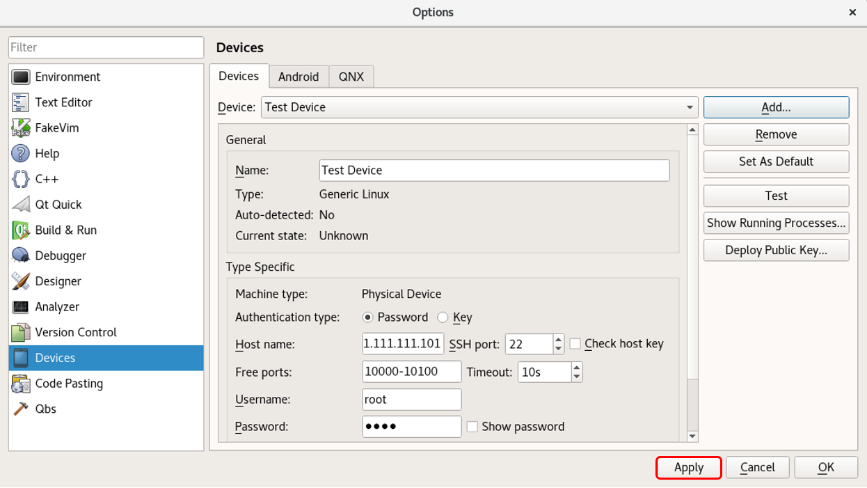 2. Device Name을 설정하고, Remote Debugging을 진행할 Target Board의 IP 주소, Username, Password를 입력하시면 됩니다.