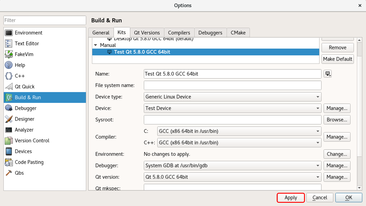 6. Kits 구성을 완료하면 Projects 탭에서 기존 Desktop Qt 5.8.0 GCC 64bit Kits가 아닌 위에서 생성한 Test Qt 5.8.0 64bit Kits로 변경해주어야 합니다.