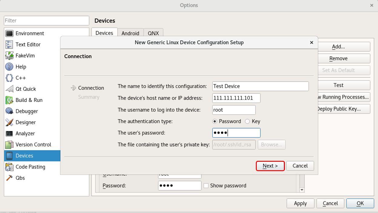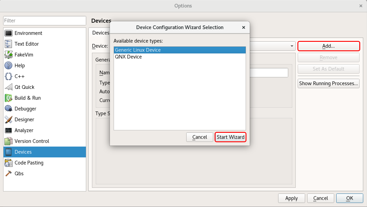 좌측 "Devices" 탭에서 "Generic Linux Device" 선택한 후 "Start Wizard"를 눌러 진행합니다.
