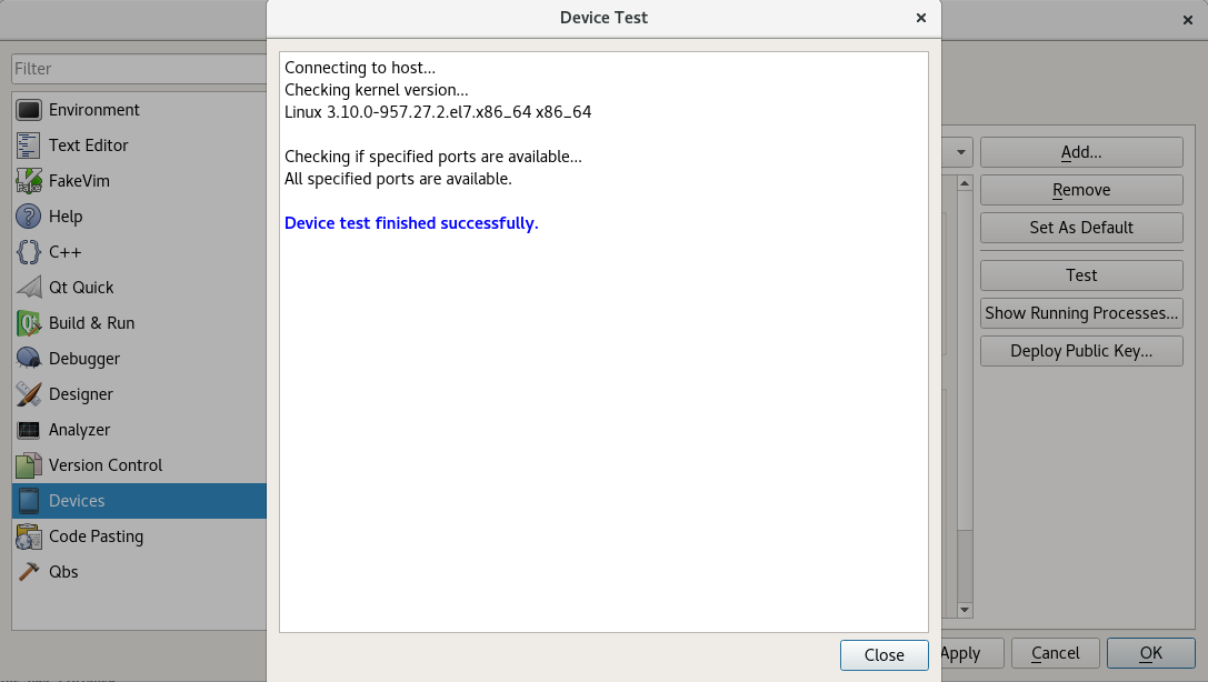 3. Device에 대한 Connect가 정상적으로 이루어질 경우 "Device test finished successfully"가 표시됩니다.