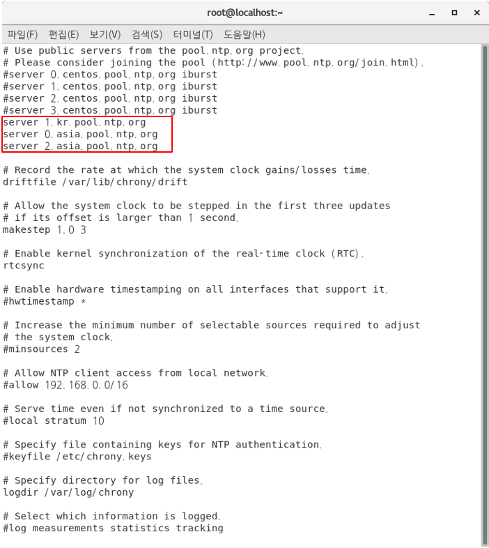 | # vi /etc/chrony.conf + 주석 후 추가 server 1.kr.pool.ntp.org server 0.asia.pool.ntp.org server 2.asia.pool.ntp.org |
