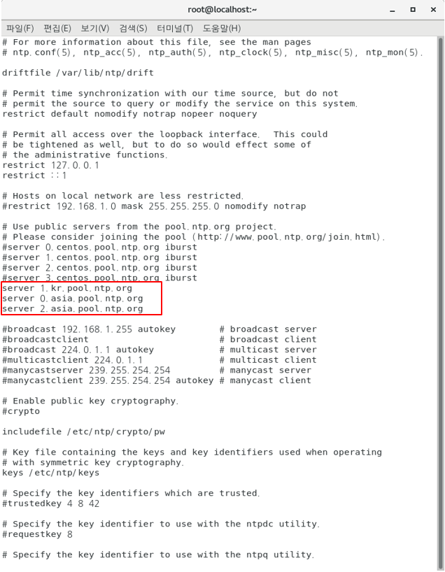 | # vi /etc/ntp.conf + 주석 후 추가 server 1.kr.pool.ntp.org server 0.asia.pool.ntp.org server 2.asia.pool.ntp.org |