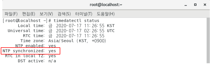 | # timedatectl status => NTP synchronized:yes # 확인 |