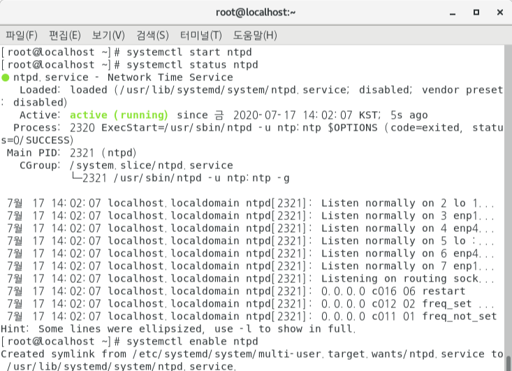 5. ntpd 데몬 시작 및 부팅시에 활성화 될 수 있도록 설정합니다.