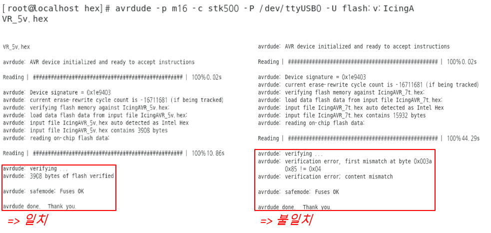 Verify는 현재 AVR에 올라가 있는 Hex 파일과 입력한 Hex 파일의 Binary 값의 일치여부를 확인합니다.