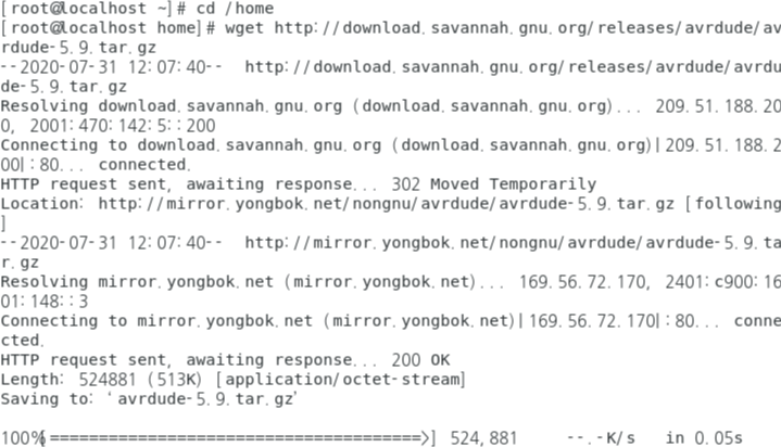 | # cd /home # wget http://download.savannah.gnu.org/releases/avrdude/avrdude-5.9.tar.gz |