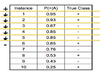 1. 각 테스트 인스턴스 P (+ | A)에 대한 앞쪽 확률을 생성하는 분류기를 사용합니다.
