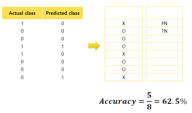 아래에서 8개의 클래스에 대해 실제 값이 0이든 1이든, 이를 정확하게 예측한 5개의 클래스를 계산에 62.5%의 Accuracy를 구할 수 있습니다.