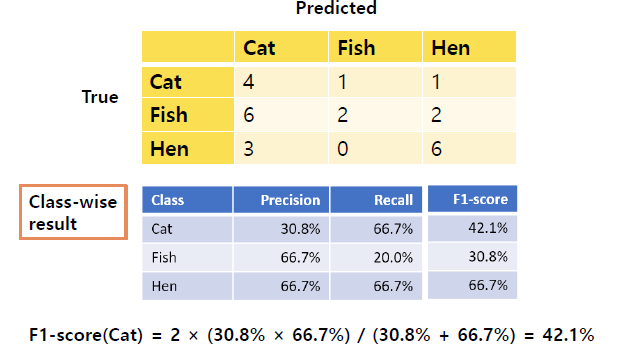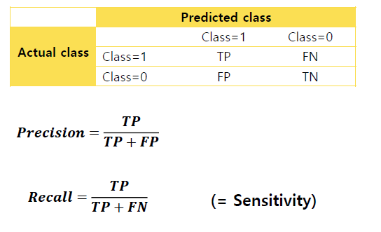 : 클래스 중에서 모델이 실제 값을 정확하게 예측하였을 경우를 계산해 구합니다.