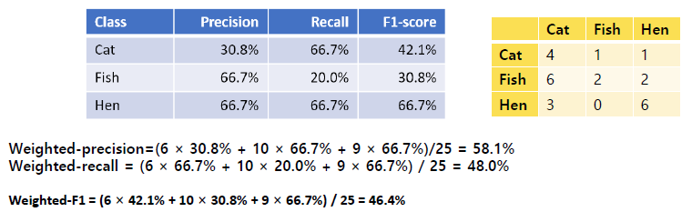 : 실제 인스턴스 수에 따라 각 클래스의 점수에 가중치를 부여하여 계산하는 방법입니다.