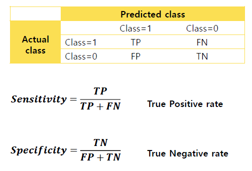 - Sensitivity (민감도) & Specificity (특이도) - Trade off 관계