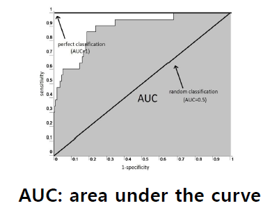 ROC curve는 그래프이기 때문에 명확한 수치로써 비교하기가 어렵습니다. 따라서 그래프 아래의 면적값을 이용합니다.