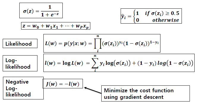 => 위에서 linear 식이 0이되는 구간이 클래스가 1일 확률과 0일 확률이 같아지는 decision boundary가 됩니다.