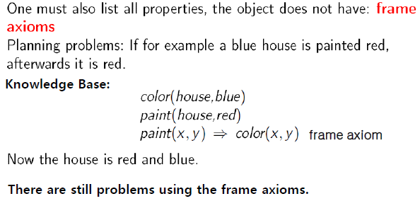 파라미터로 time ( 예를 들어 time stamp) 을 사용하여 확장한 언어를 Situation Calculus 라고 한다. 이 경우 지식베이스는 시간이 지남에 따라 방대하게 커져 지식기반 시스템의 효율성이 떨어지게 된다. 이러한 문제를 조금 완화하기 위하여 시간이 지나도 변치 않는 속성 등은 axiom 으로 표현하여 필요시 이를 사용하게 된다. 이러한 axiom 을 Frame axiom 이라고 부른다.