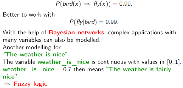 논리의 약점 중의 하나는 불확실한 지식을 표현하기 어렵다는 점이다. 왜냐하면 Logic 은 monotonic 하기 때문이다. 즉 Logic 에서 formula 가 참이면 새로운 지식이 들어와도 여전히 그 formula 는 참이기 때문이다. 인공지능 분야에 불확실한 지식의 예로 Flying Penguin 이라는 문제가 있다.