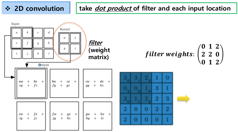 : convolutional layer에서는 각각의 locality patch들이 filter와 convolution이 되어 output 값 도출,