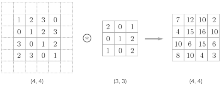 바깥 쪽의 열과 행을 0으로 채워 Convolution하여 결과 값의 행렬의 크기를 유지할 수 있습니다.