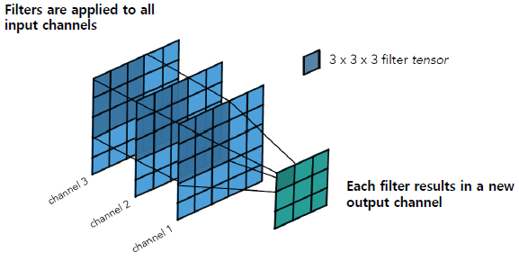 : input channel이 RGB로 3가지일 경우, filter size도 depth에 맞추어 정해주어야 합니다.